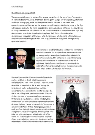 There are multiple methods to analyze films, including using Lacey's framework of five elements (setting, character, narrative, iconography, style) to determine a film's genre. Auteur theory can also be used to analyze a director's style and determine if they have characteristics of an auteur such as consistent themes or innovation. Films are analyzed by looking at conventions in each element and comparing them across genres. For example, Mean Girls contains conventions of teen comedy but also subverts stereotypes. Goodfellas is analyzed as the work of auteur Martin Scorsese due to its themes and influence despite initial lack of commercial success. Analyzing films using these methods provides deeper appreciation and understanding when viewing other films.