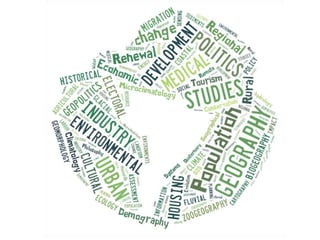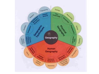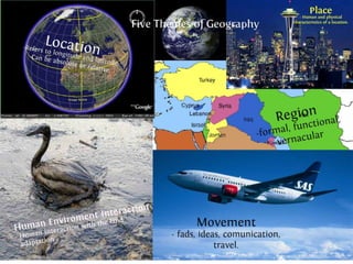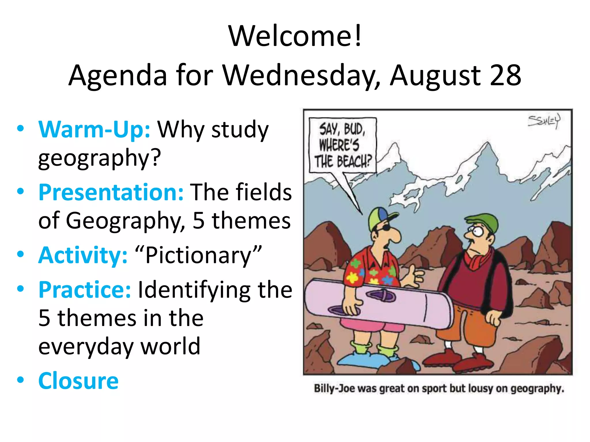 The document provides an agenda for a geography class that will cover the key concepts of geography including the five themes: location, place, region, human-environment interaction, and movement. It defines each theme and provides examples to help students understand and identify the themes. It also includes warm-up questions, an activity using pictionary to practice identifying themes, and a closure for the class.