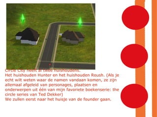 Circle City heeftal twee huishoudens. Het huishouden Hunter en het huishouden Roush. (Als je echt wilt weten waar de namen vandaan komen, ze zijn allemaal afgeleid van personages, plaatsen en onderwerpen uit één van mijn favoriete boekenserie: the circle series van Ted Dekker) We zullen eerst naar het huisje van de founder gaan.