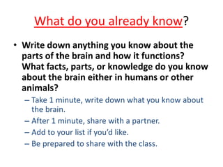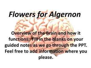 The document outlines an educational overview of the brain, including its structure, functions, and models such as the triune brain, which divides the brain into three areas: the neocortex, limbic system, and reptilian brain. It describes how these areas impact learning and emotional responses, emphasizing the management of threats and motivation in the learning process. Additionally, it introduces the concept of multiple intelligences, highlighting nine types that people possess.