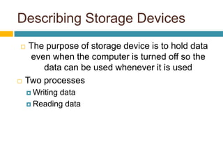 Magnetic storage devices like hard drives and floppy disks store data using magnetism on metal platters. Optical storage devices like CDs and DVDs use lasers to read data encoded in pits and lands on plastic discs. Solid state devices store data using physical switches rather than magnetism or lasers. Common storage devices include hard drives for primary storage, floppy disks and flash drives for removable storage, and tapes for backups. Data is organized on disks in tracks and sectors to allow efficient reading and writing.