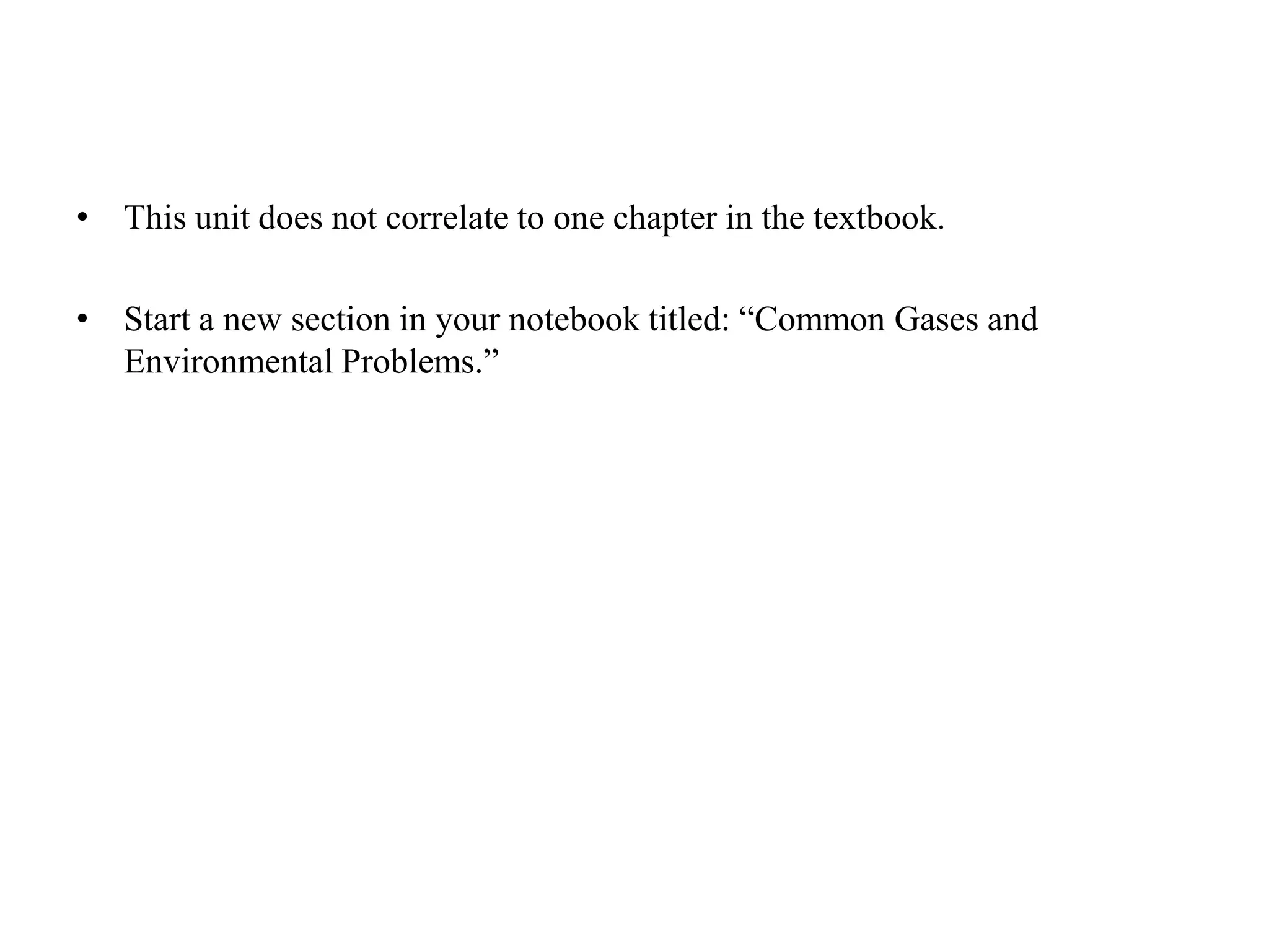 This document provides instructions for students to complete an assignment on common gases and environmental problems. It directs students to start a new section in their notebook, complete assignments and activities in order by meeting posted deadlines, and bring calculators to class daily. It lists questions that will be focused on, including the root causes of ozone depletion, acid rain, and global warming, and gases produced by human activities that cause environmental problems.