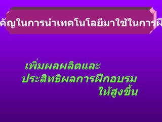 2. เทคโนโลยีการฝึกอบรมประเภทเทคนิควิธีการหมายถึง เทคโนโลยีที่มีลักษณะเป็นระเบียบวิธี และเทคนิค ซึ่งไม่ใช่วัตถุสิ่งของ แต่มีกรอบ รูปแบบ องค์ประกอบและ / หรือ สัญลักษณ์ เกณฑ์ และมาตรฐานกระบวนการ และขั้นตอนตลอดจน วิธีการปฏิบัติที่ถูกกำหนดไว้เป็นแนว สำหรับการตรวจสอบความเหมาะสม และความถูกต้อง - 12.