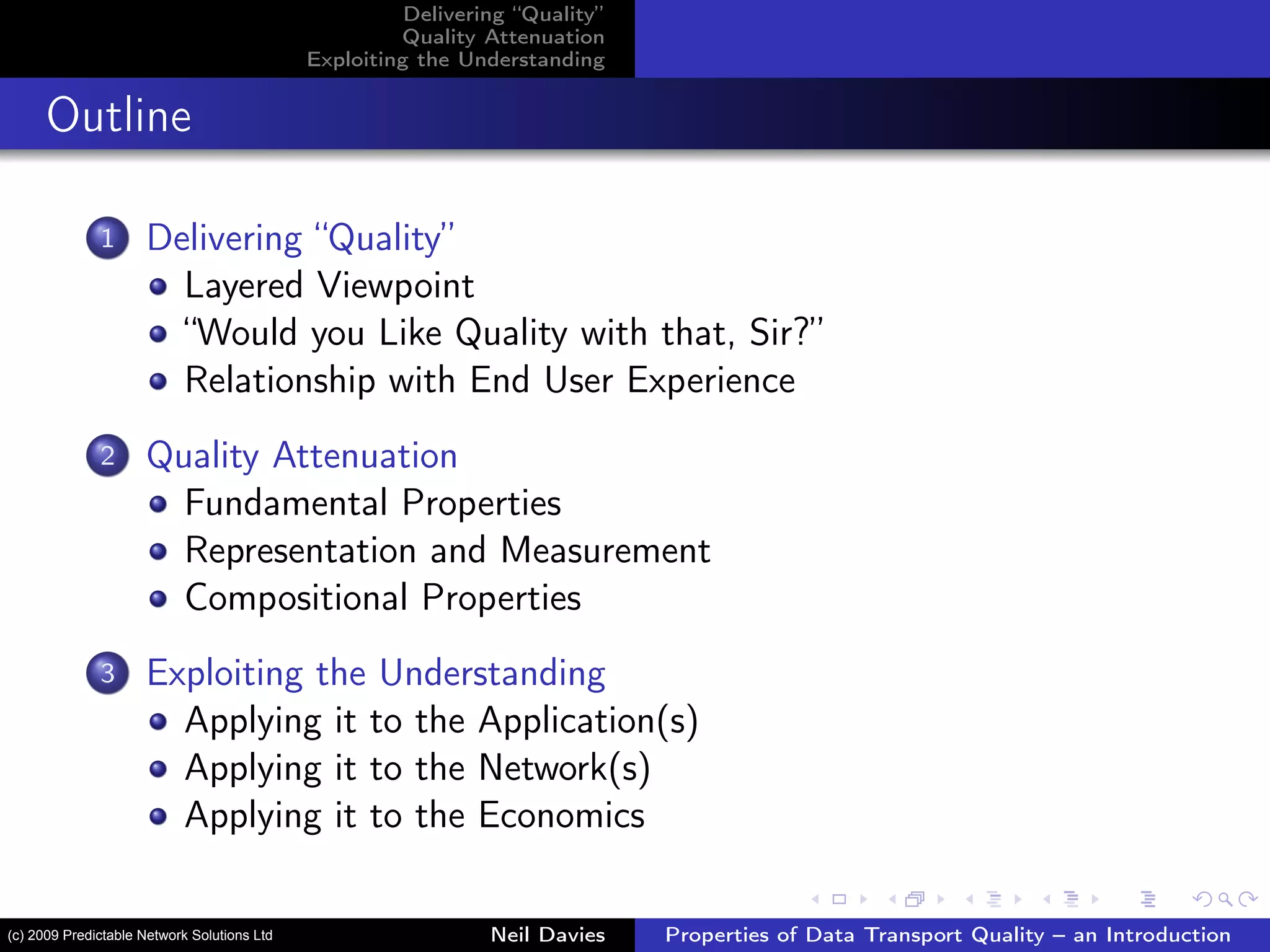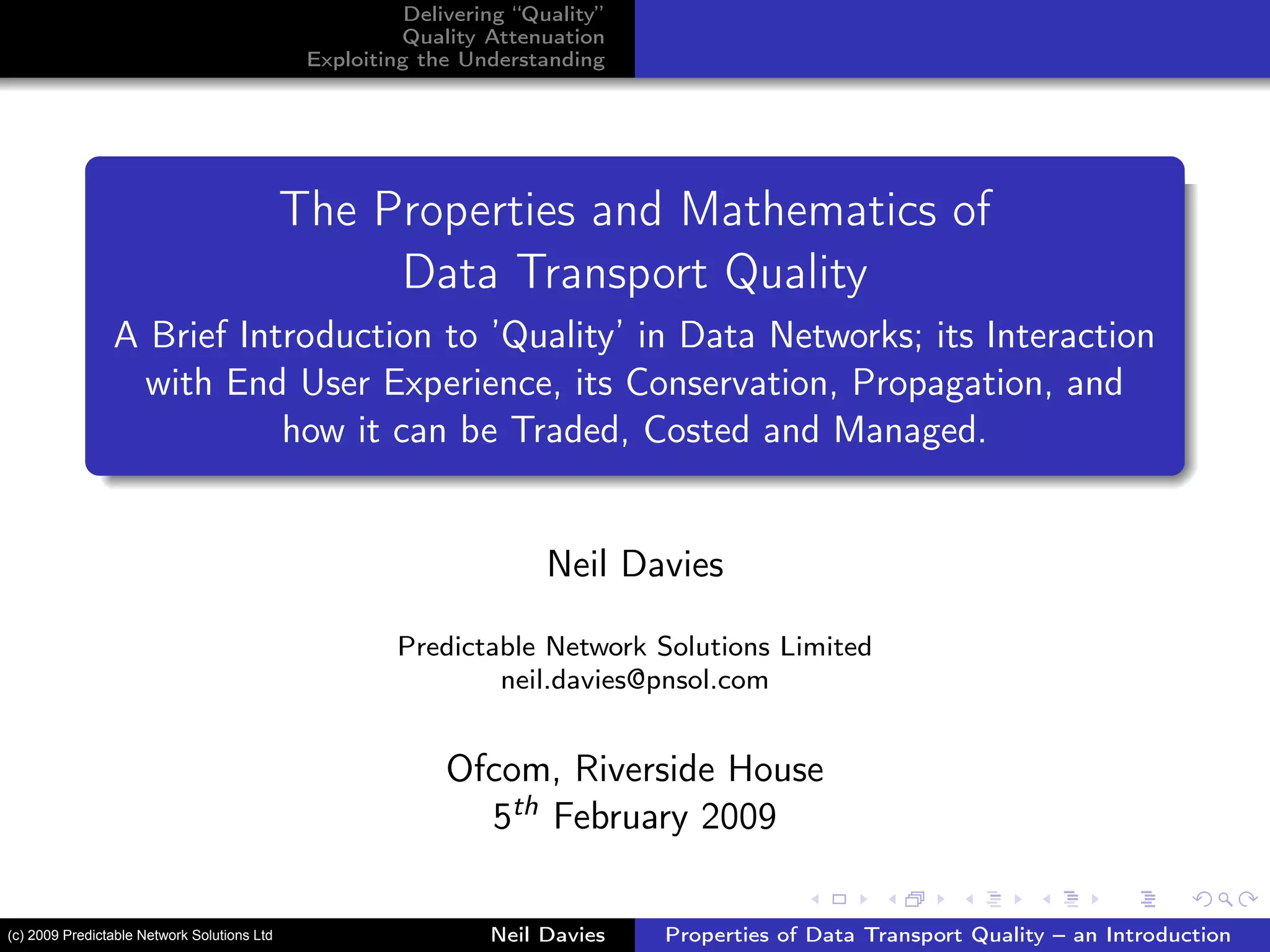 The document provides an overview of data transport quality in networks, discussing how quality interacts with user experience and can be managed through understanding quality attenuation. It outlines the essential concepts of quality attenuation, including its properties, measurement, and the relationship between delay, loss, and user experience. The author emphasizes that simply adding bandwidth does not equate to enhanced quality, highlighting the importance of managing the underlying factors contributing to quality attenuation.