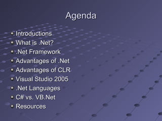 The document provides an introduction to .NET, describing what it is, its core components like the .NET Framework and Common Language Runtime (CLR), advantages such as cross-language development and improved security, and popular languages for .NET development like C# and Visual Basic .NET. Key aspects of the .NET Framework are outlined, including namespaces for organizing classes, support for web standards, and ADO.NET for database access. Differences between C# and Visual Basic .NET are highlighted, such as syntax and intended uses as a rapid application development tool.