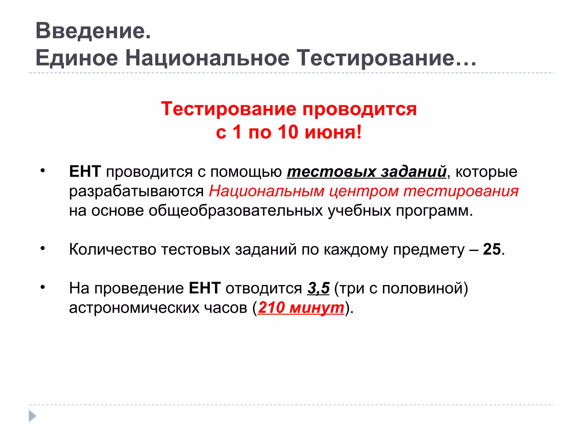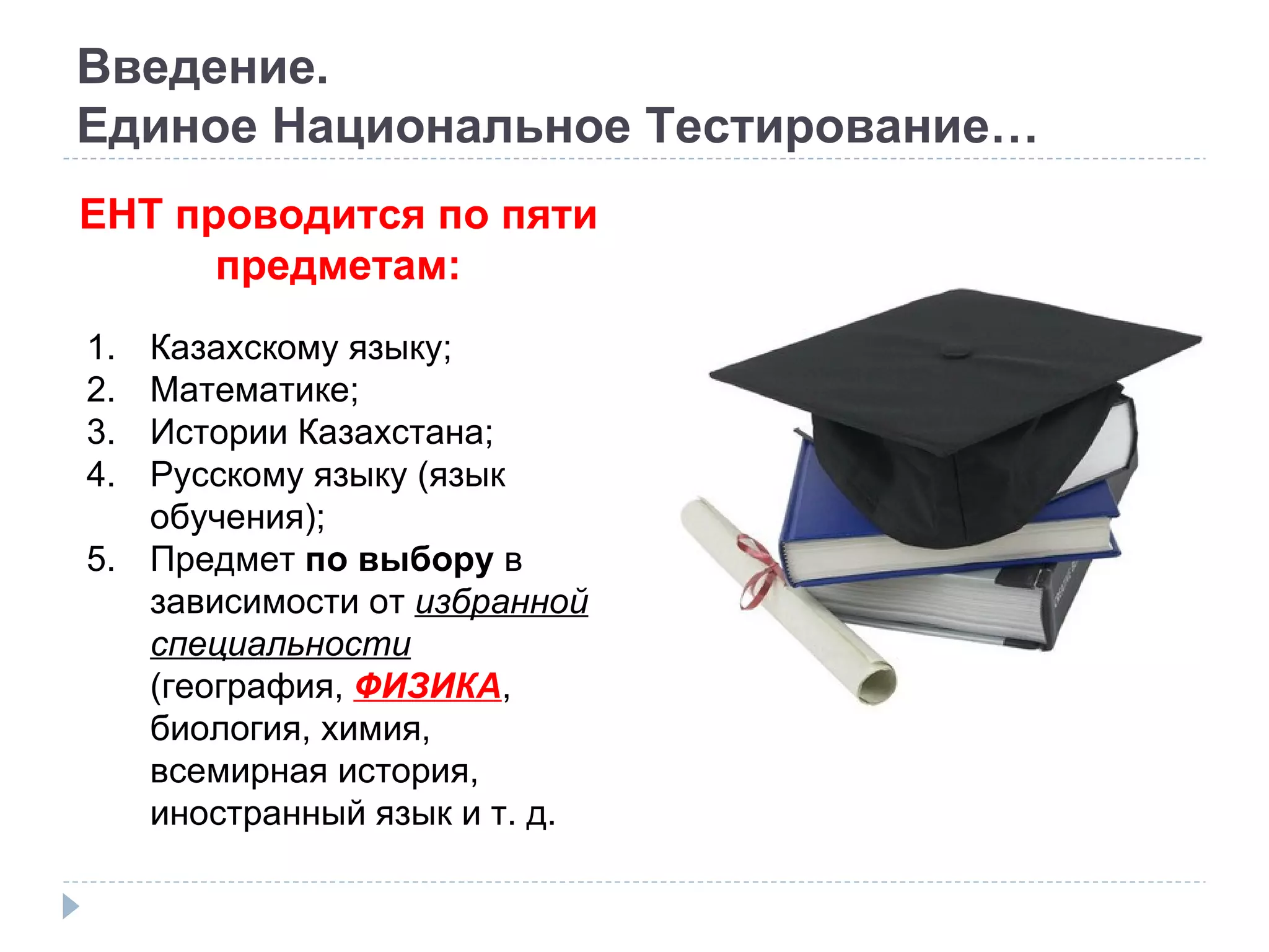 Документ описывает единое национальное тестирование (ЕНТ) в Казахстане, которое проводится по пяти предметам и длится 3,5 часа. Участники должны получить минимальное количество баллов для получения аттестата и допуска к образовательным грантам. Важное внимание уделяется подготовке к профильному предмету, физике, включая решение тестовых заданий и знание основных формул и понятий.