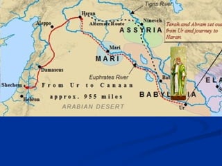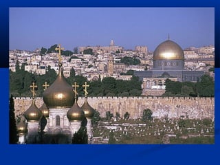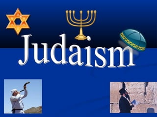 The document provides an overview of key aspects of Judaism, including its origins, beliefs, important figures, and major events. It discusses how Judaism began as the first monotheistic religion, with the Hebrews settling in Palestine. Some key events and figures mentioned include Moses leading the Exodus from Egypt around 1300 BCE, King David uniting the empire, and the kingdom splitting into Israel and Judah in 930 BCE.
