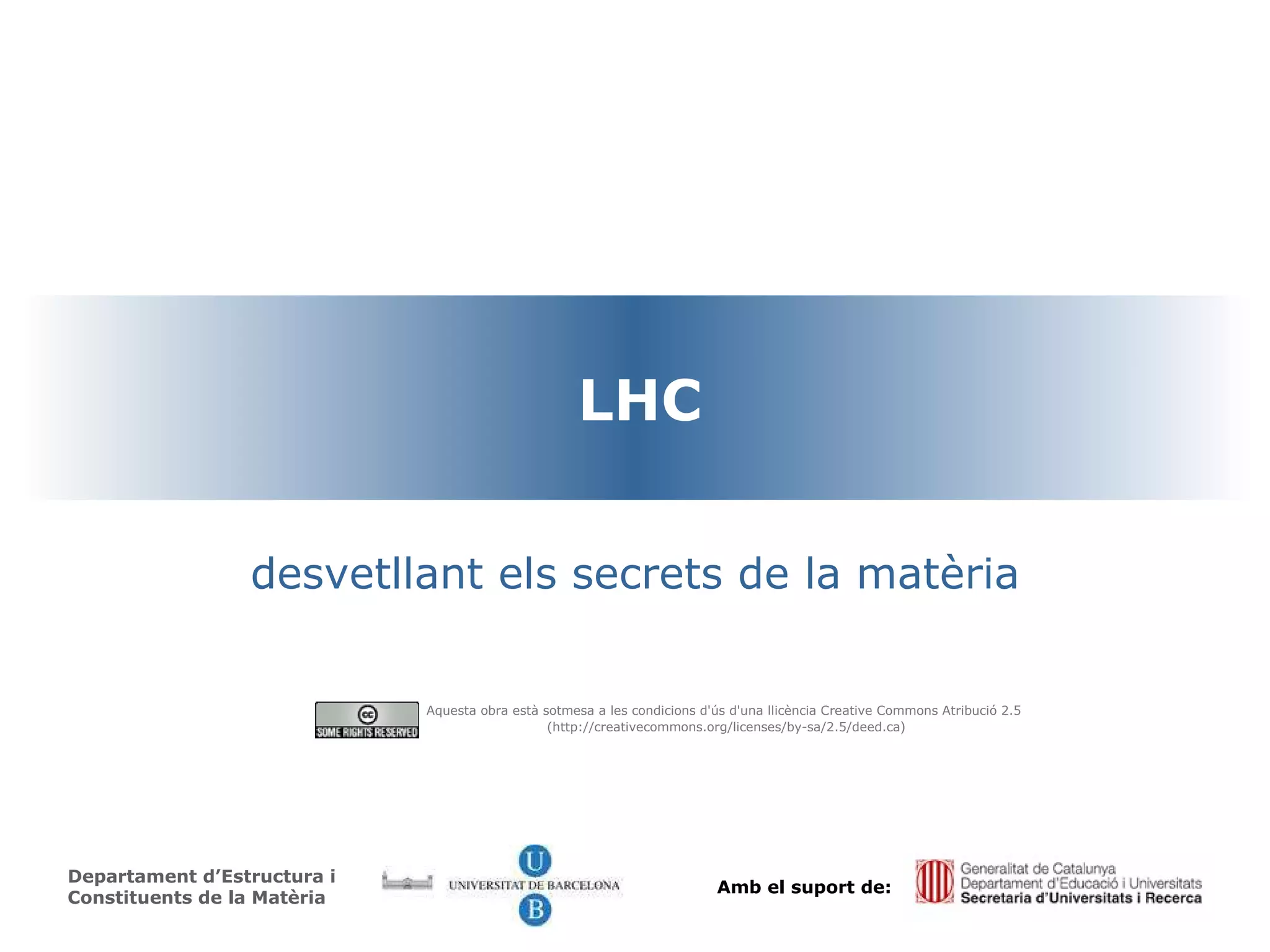 LHC desvetllant elssecrets de la matèria Departament d’Estructura i Constituents de la Matèria Amb el suport de: Aquesta obra està sotmesa a les condicions d'ús d'una llicència Creative Commons Atribució 2.5 ( http://creativecommons.org/licenses/by-sa/2.5/deed.ca )