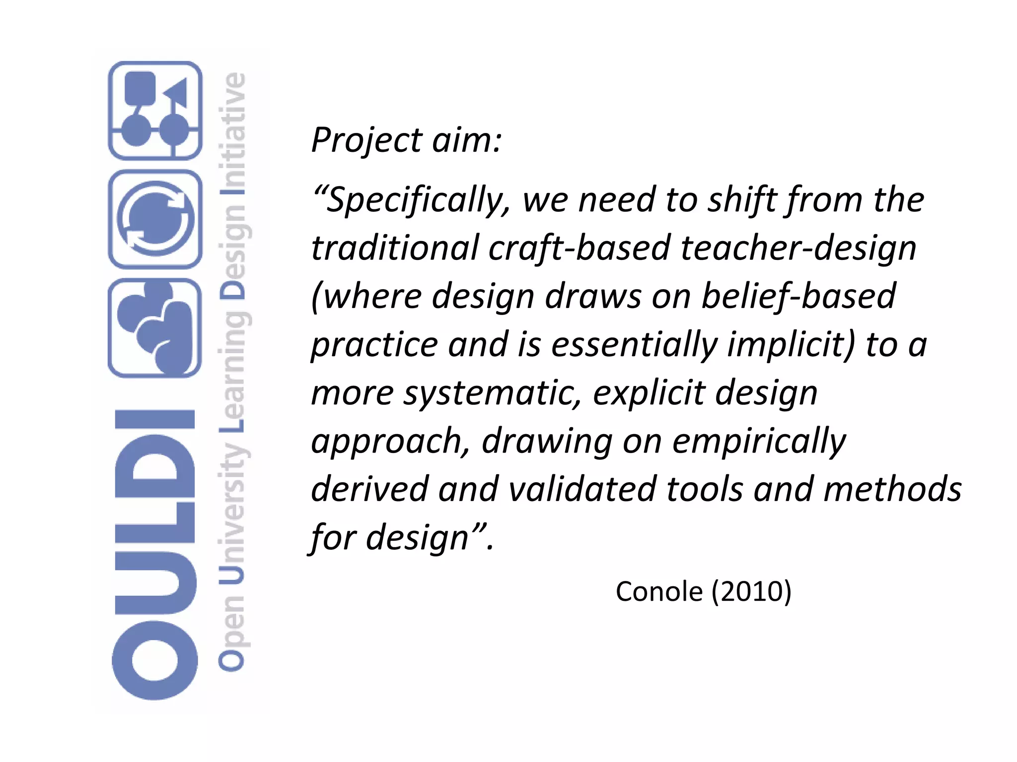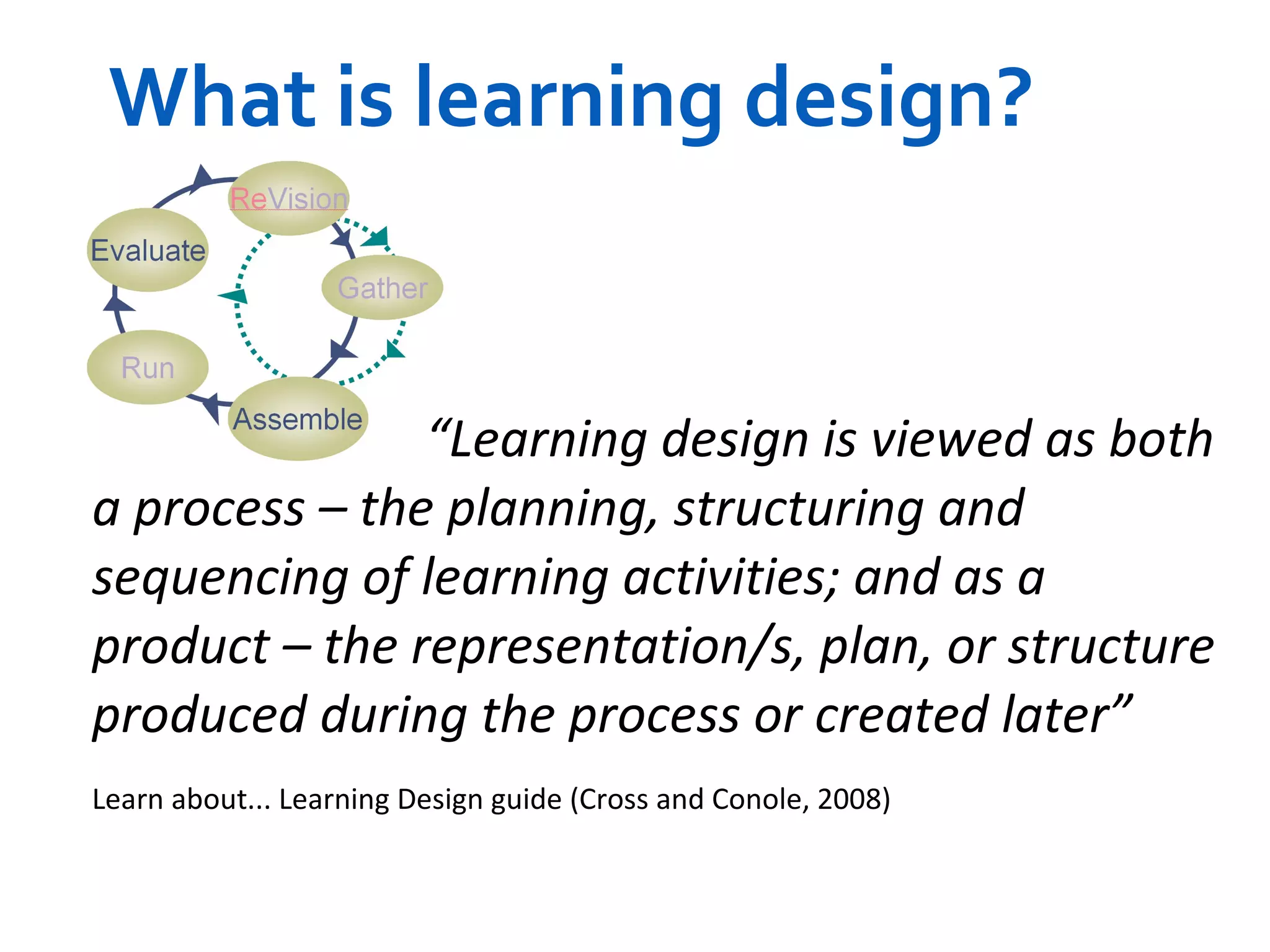 The document discusses using a learning design approach to shift from implicit, belief-based teaching practices to more explicit, evidence-based design informed by validated tools and methods. It describes learning design as both a process of planning learning activities and a product - the representation or structure produced. Key aspects include design as a conscious, creative, communicative, and social process. Challenges of this approach include balancing precision with the natural fuzziness of practice, and balancing personal designs with those meant for sharing.