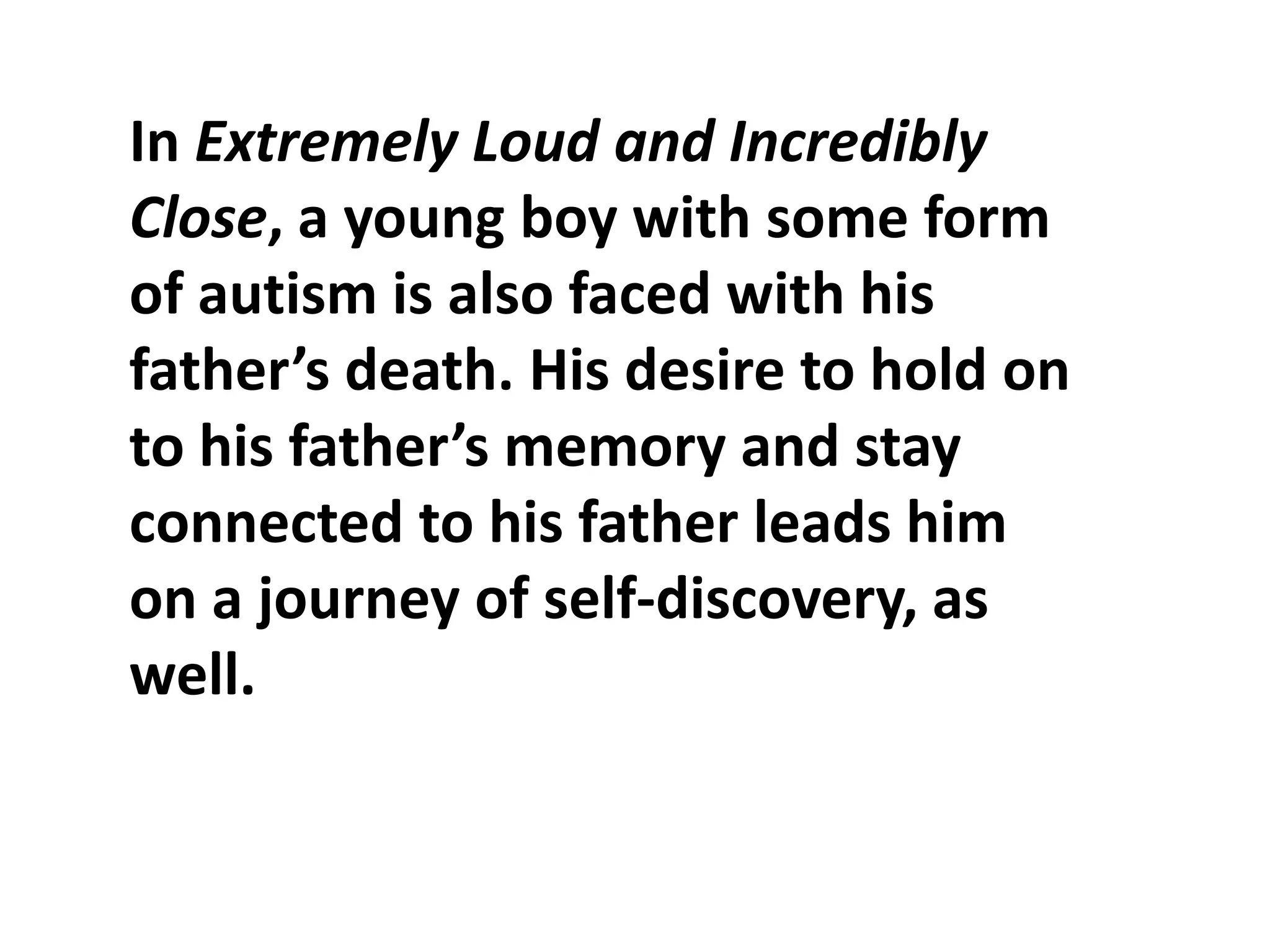 The document compares two stories, The Story of Edgar Sawtelle and Extremely Loud and Incredibly Close. In both stories, a young boy with a disability experiences the death of his father and goes on a journey of self-discovery to cope with the loss. The document states that both stories explore the devastating effects of losing a loved one and how the authors use characterization and imagery to develop this theme.