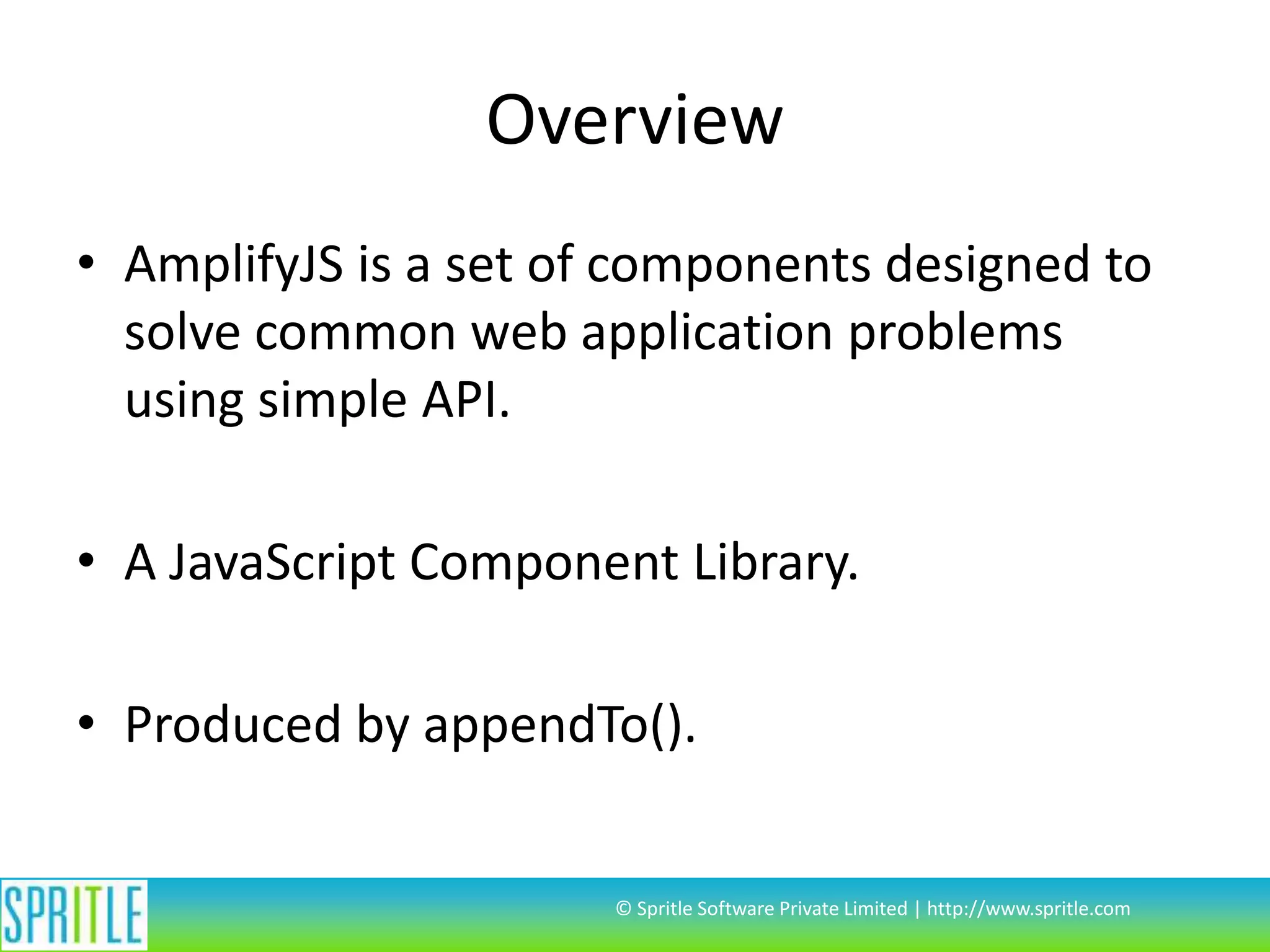 AmplifyJS is a JavaScript component library produced by Spritle Software that provides tools for common web application problems. It includes APIs for making AJAX requests, client-side component communication, browser storage, and publishing/subscribing to messages. The request API provides a way to define, request, cache, and handle responses for API calls. The store API provides a consistent way to store and retrieve data in client-side storage. The pub/sub API facilitates publishing messages that components can subscribe to.
