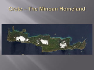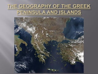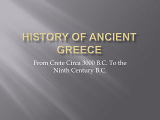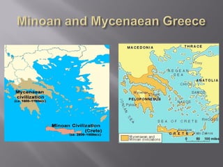The document provides an overview of Greece from around 3000 BC to the 9th century BC. It describes the geography of Greece including the mainland and thousands of islands. It then outlines the early civilizations that developed in Greece including the Minoans on Crete from around 3000 BC and the Mycenaeans on the mainland from around 2000 BC. It notes that both civilizations declined around 1200 BC likely due to migrations and disasters known as the Bronze Age Collapse. Dorian migrations then led Greek populations to scatter in the following centuries.