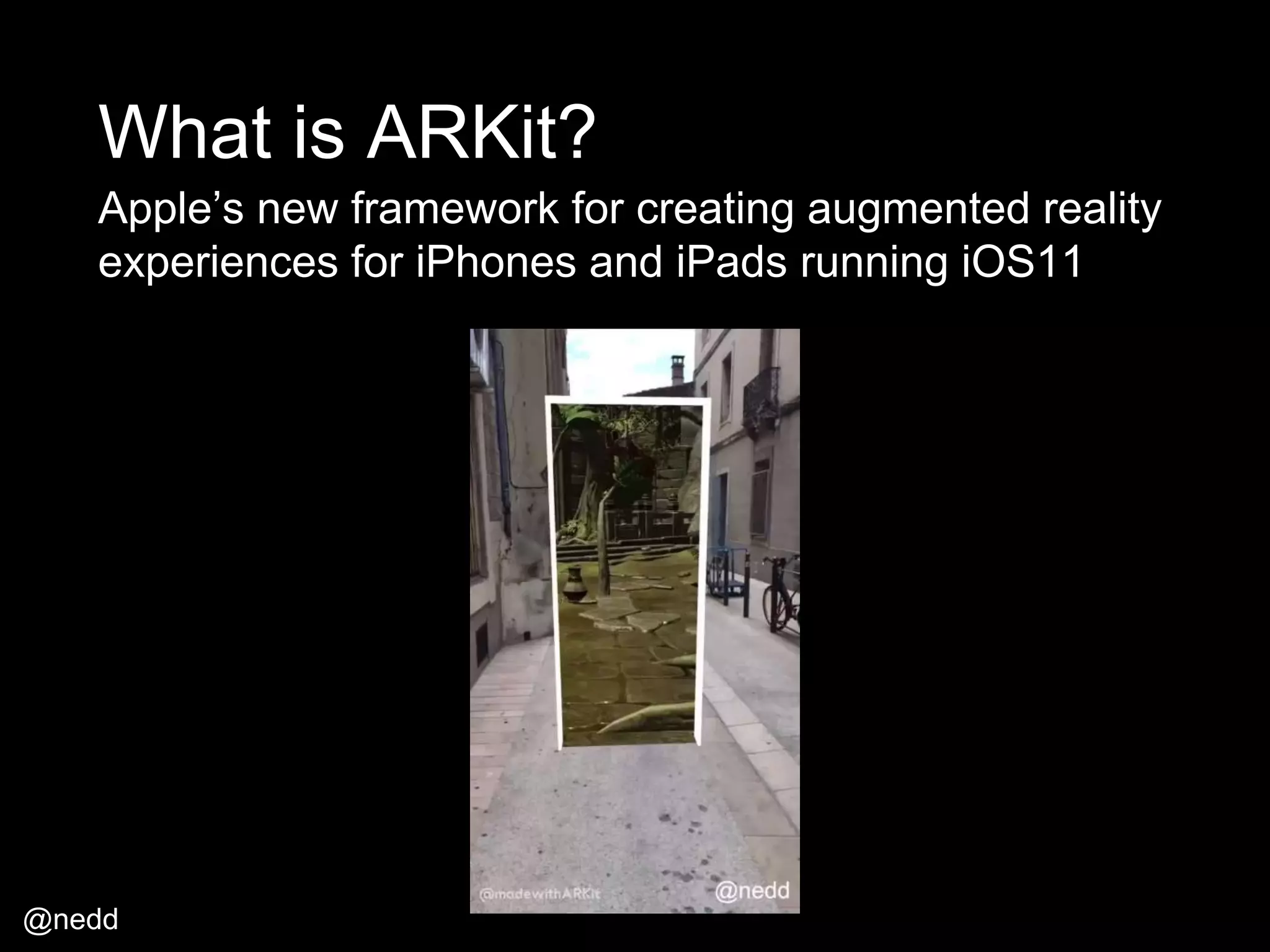 ARKit is Apple's new framework for creating augmented reality experiences on iOS 11 devices using only the iPhone's single camera and sensors. It allows developers to build AR apps for over 100 million iOS devices without needing additional resources like image triggers. ARKit uses technologies like visual-inertial odometry and scene understanding to detect horizontal planes and place virtual objects that are estimated to scale in the real world. Popular game engines like Unity and Unreal are supporting ARKit integration to make development easier.