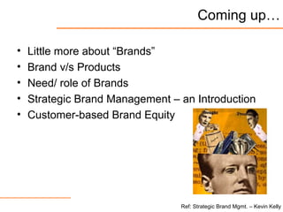 This document provides an introduction to strategic brand management. It discusses key concepts like the definition of a brand, the difference between brands and products, and the roles and benefits of brands for both customers and manufacturers. It also outlines the components of strategic brand management, including identifying brand positioning and values, implementing marketing programs, measuring brand performance, and growing brand equity over time. Finally, it discusses how to create, measure, and manage customer-based brand equity.