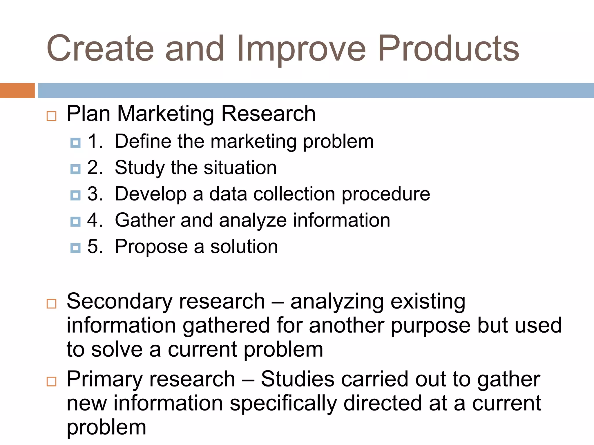 This document provides an overview of key concepts related to marketing research, product planning, pricing, distribution channels, and promotion. It discusses how businesses conduct marketing research to define problems and gather information to solve issues. It also outlines the typical parts of a product, different product planning procedures, and key characteristics of services. The document then explains various factors that influence pricing, how to calculate the price of a product, and different pricing strategies. It introduces distribution channels and reasons for using indirect or direct channels. Finally, it defines promotion and common promotional tools like advertising, and outlines the basic communication process.