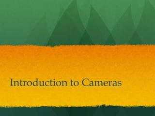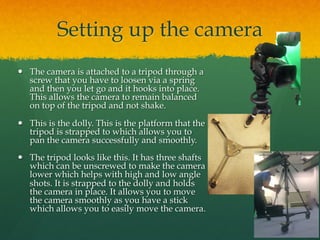 The document provides an introduction to setting up and using cameras. It discusses attaching the camera to a tripod using a screw, and attaching the tripod to a dolly to allow for panning and smooth movement. The tripod has three shafts that can be unscrewed to adjust the camera height for different shots. White balance settings like auto, tungsten, and daylight are explained to adjust color according to lighting conditions. Parts of the camera like the lens with focus, zoom, and frame rollers, a spirit level, and monitor are identified. Finally, different camera shots like over the shoulder, close up, high angle, low angle, and wide are defined.