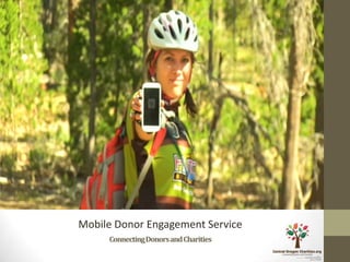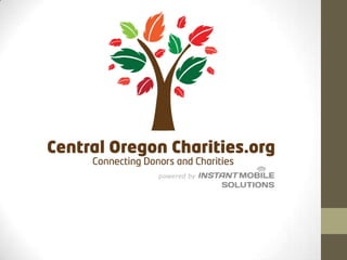 The document introduces centraloregoncharities.org, a mobile donor engagement service designed to connect donors with non-profit organizations for both iOS and Android devices. It enables users to locate charities, make easy cash and in-kind donations, and communicate effectively with organizations to drive deeper engagement. The service will launch on November 13 with over 15 participating non-profits and aims to enhance awareness and facilitate giving.