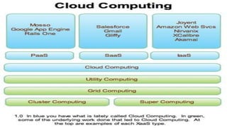The document discusses a presentation by Arun Chandran on cloud computing, detailing its types such as IaaS, PaaS, and SaaS, and their respective functionalities. It covers the characteristics of private, public, community, and hybrid cloud infrastructures, along with examples of companies like Salesforce that utilize these services. Additionally, it highlights new features introduced in the Winter '13 release, including enhancements to developer tools and Apex code.