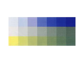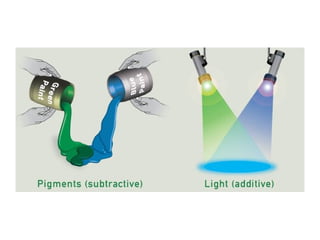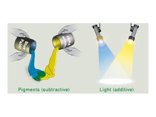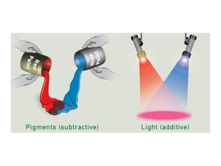 - The three properties of color are hue (name of color), value (lightness or darkness), and intensity (brightness or saturation). Changing these properties affects how colors are mixed and perceived.
