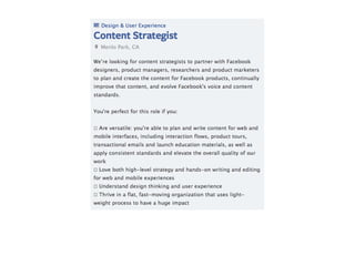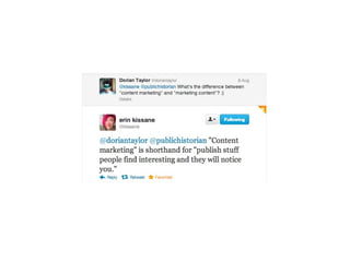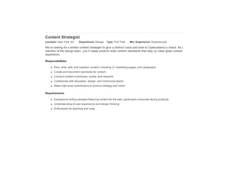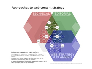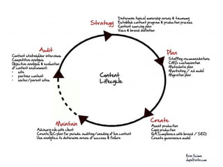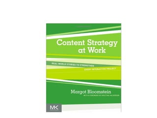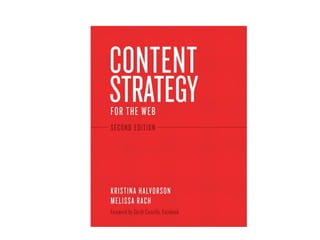 This document summarizes a workshop on content strategy held on January 25, 2013. It introduces content strategy and discusses evaluating existing content through inventories and audits, defining key messages, and using content strategy to plan new content creation and governance. Content strategy is presented as a process to ensure an organization's content is useful, usable and helps achieve its goals.