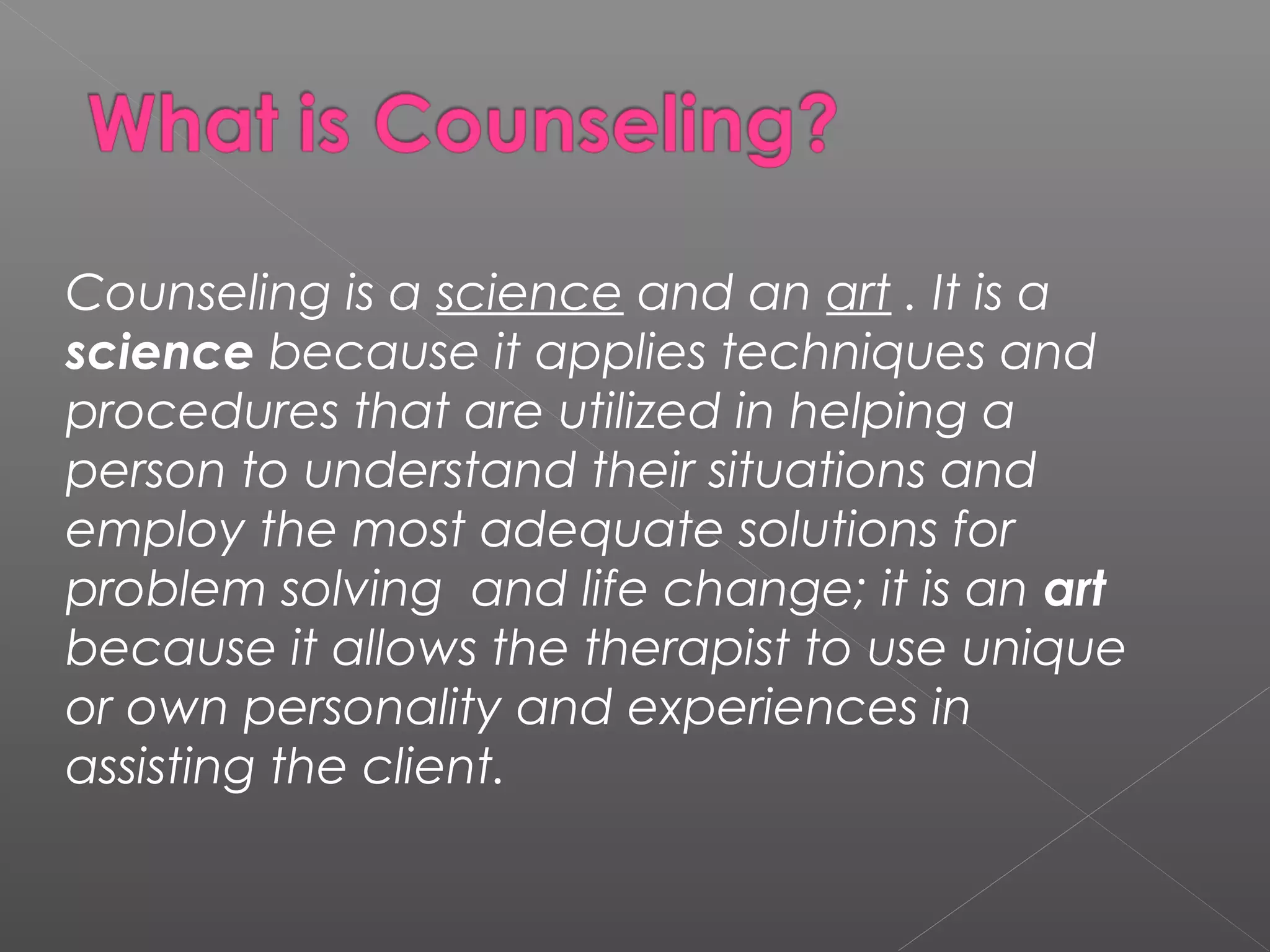 Counseling is both a science and an art that aims to help clients understand themselves and their situations in order to solve problems and facilitate personal growth and change. It involves a professional relationship between a trained counselor and client to clarify the client's perspective and resolve emotional or interpersonal issues. Christian counseling specifically applies biblical principles using professional counseling techniques to treat clients' issues and stimulate their spiritual growth. The goals of counseling include facilitating behavior change, improving relationships and coping skills, and promoting overall development, including spiritual transformation through salvation.
