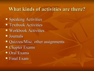 This document provides an overview of the structure and activities for an online introductory French course. It discusses the various components on the Blackboard site including announcements, assignments, exams and discussion boards. It also describes the textbook, workbook, journal and speaking activities that will take place on the iLrn site and Skype/Adobe Connect. Students are instructed to check Blackboard regularly for updates and submit assignments by specified deadlines.