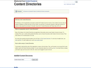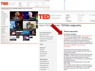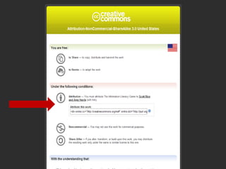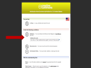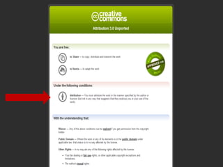 This document introduces Creative Commons licenses as an alternative to traditional copyright. Creative Commons licenses allow creators to choose some rights to reserve for their work rather than reserving all rights automatically like copyright. There are several Creative Commons license options that allow creators to select which rights they want to reserve, such as attribution, share-alike, non-commercial, and no derivatives. Creators can combine these conditions in different ways to create a customized license for their work on the Creative Commons website. The licenses are designed to facilitate the free exchange of knowledge while still giving creators control over how their works can be used.
