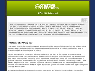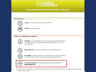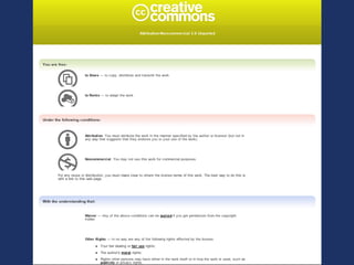 This document provides an introduction to Creative Commons licensing. It explains that CC licenses allow creators to reserve some rights while granting others, moving from "All Rights Reserved" to "Some Rights Reserved". The document defines the basic CC license types (Attribution, Non-Commercial, No Derivatives, Share Alike) and combinations. It addresses myths about CC and describes the anatomy of a CC license, including icons, human-readable deeds, machine-readable code, and legal text. It also covers international licensing, enforceability, and additional CC tools like CC0 and CC+.