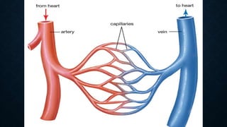 The cardiovascular system transports nutrients, removes waste, and facilitates gas exchange through the blood and heart. It consists of the heart, arteries, veins, and capillaries. The heart is a four-chambered muscular pump located in the chest that circulates blood through two circuits: systemic circulation between the heart and body and pulmonary circulation between the heart and lungs. Arteries carry blood away from the heart while veins return blood to the heart. Capillaries connect arterioles and venules to exchange materials. The cardiovascular system maintains circulation through these components and circuits.