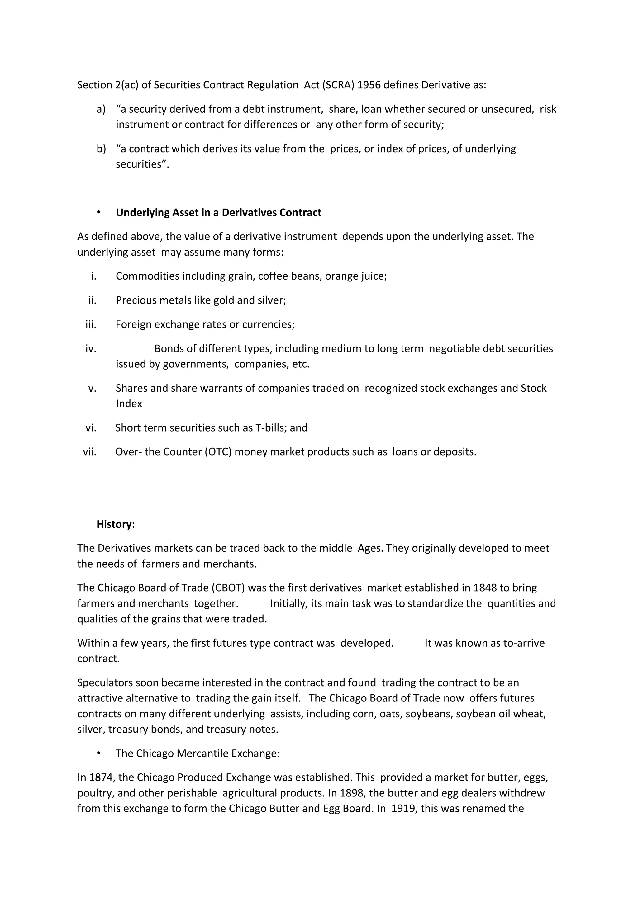 Derivatives are financial instruments whose value is based on an underlying asset such as commodities, precious metals, currencies, bonds or stock indices. The two main types are forwards, which are customized bilateral contracts, and futures, which are standardized contracts traded on exchanges. A key feature of derivatives is that their value changes in response to changes in the price of the underlying asset. Exchanges help make derivatives markets liquid with lower transaction costs.