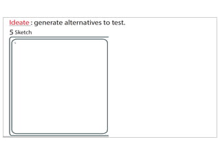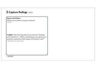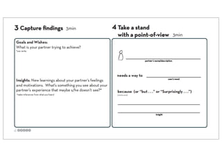 The document discusses design thinking and its process. It explains that design thinking involves examining a problem, gathering insights from interviews, reframing the problem, generating and iterating on solutions, testing solutions and getting feedback to learn and improve designs. The example used is having partners design wallets, interview each other, and redesign wallets based on insights to better understand the design thinking process.