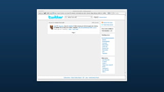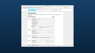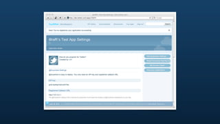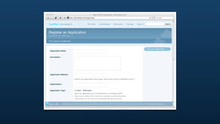 The document discusses the capabilities of the Twitter API, including its REST, Search, and Streaming APIs. It outlines methods for authentication using OAuth, tools available for developers, and detailed examples of accessing user and status objects through API calls. Additionally, it provides guidance on constructing API requests and handling rate limits.