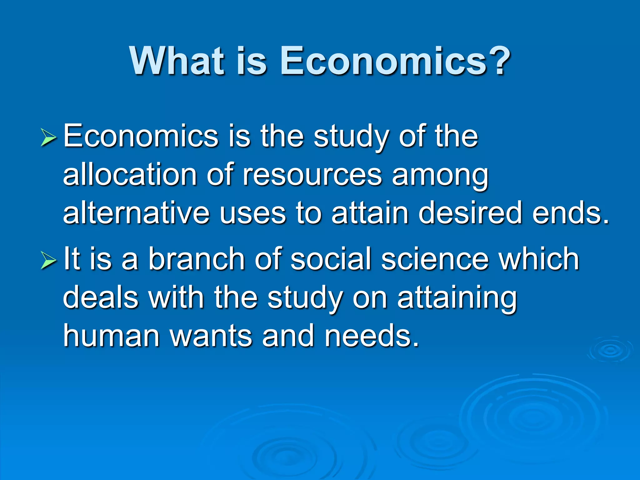 Economics is the study of how scarce resources are allocated to satisfy unlimited human wants. It is divided into microeconomics, which examines individual parts of the economy like supply and demand, and macroeconomics, which looks at the overall economy of a nation. A key concept is that resources are scarce while wants are unlimited, so people must make economic choices and trade-offs to allocate resources efficiently among alternative uses. Needs are basic goods necessary for survival while wants enhance life comfort, and both vary between individuals and change over time. Scarcity exists when resources are insufficient to meet all wants, and can occur due to lack of physical resources or inability to access existing resources.