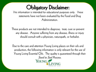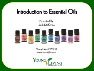 This document provides an introduction to essential oils presented by Jodi McKenna of Young Living. It discusses what essential oils are, their history of use, and their benefits. Specific essential oils like frankincense, lavender, lemon, and peppermint are highlighted for their therapeutic properties. Application methods like internal, topical, and aromatic use are covered. Proper use and dilution of essential oils is also addressed. The presentation encourages ordering starter kits to begin using and enjoying Young Living essential oils.