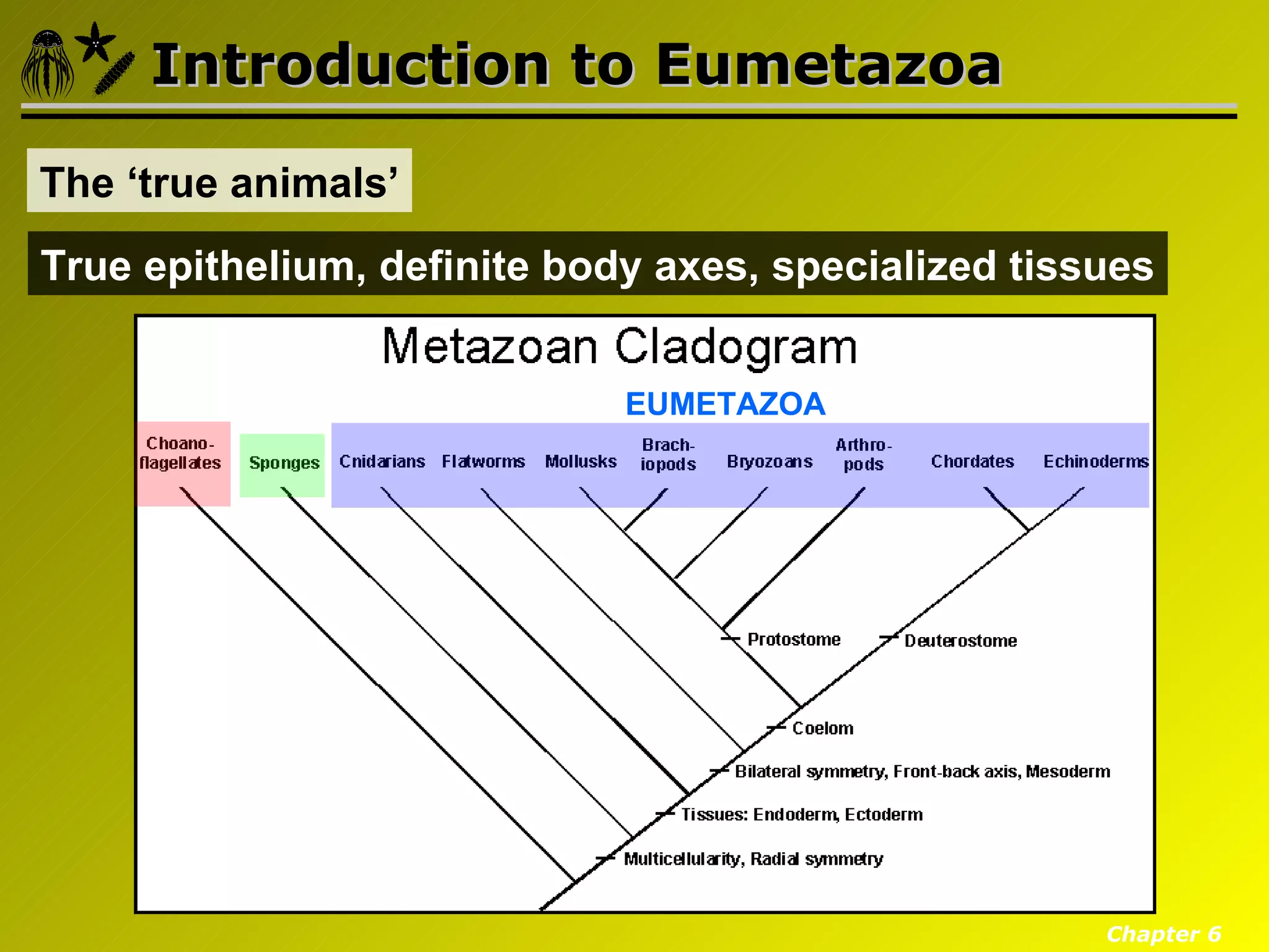 Eumetazoa are the "true animals" that possess true epithelia with basal laminae, definite body axes, and specialized tissues. They have several key characteristics including epithelial tissues that form protective barriers and regulate compartments, a hydrostatic skeleton that uses fluid pressure for support and movement, and muscles, neurons, and senses that allow for complex responses to the environment. Eumetazoans undergo gastrulation during development to form the three primary germ layers and have diverse growth forms ranging from solitary to modular colonial organisms.