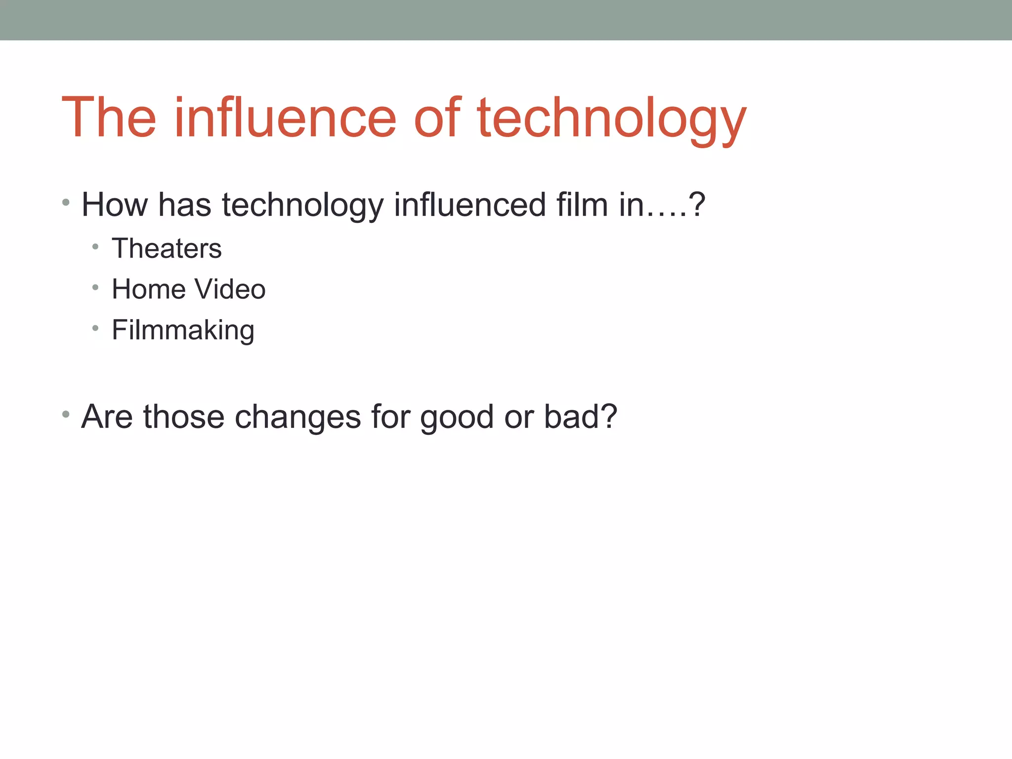 This document discusses how technology has influenced the film industry over time. It begins with an overview of how technology has impacted theaters, home video, and filmmaking. Then it discusses several key technological developments like the introduction of sound in 1927 and the shift to widescreen formats in the 1950s due to declining theater attendance. Currently, major trends are 3D and IMAX movies aimed at creating a unique theatrical experience, the rise of low-budget independent films due to more affordable equipment and distribution channels, and the future of digital delivery and crowdsourced film projects.