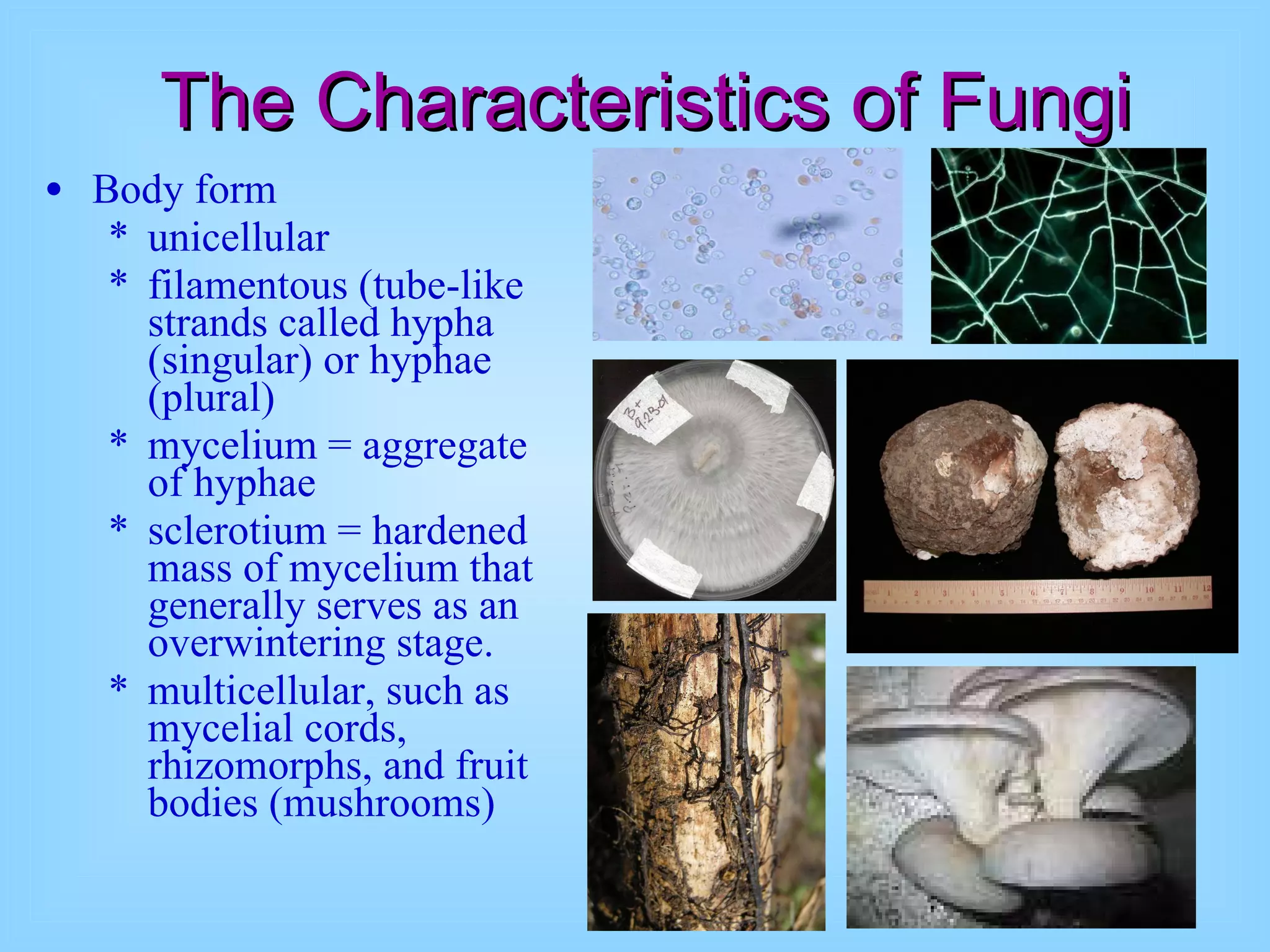 The document provides information about the characteristics of fungi. It discusses that fungi can have unicellular, filamentous, or multicellular body forms. It also describes that fungi are heterotrophic and can be saprophytes, symbionts, or parasites. Key characteristics of fungi include their hyphal growth, reproduction through spores, and roles in decomposition, symbiosis, and as pathogens. The major phyla of fungi are also introduced based on characteristics of their sexual structures and spore motility.