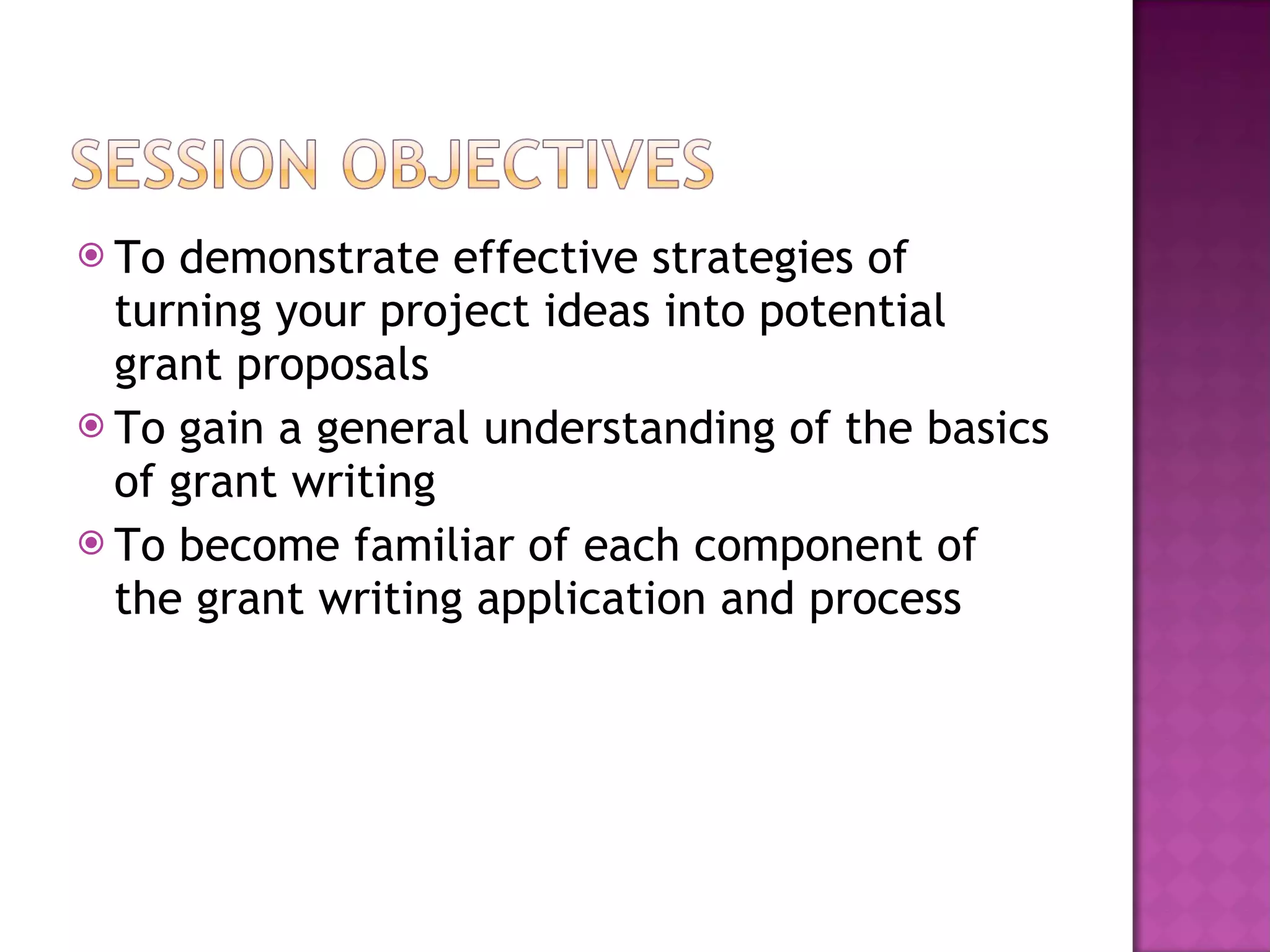 3) It reviews the typical components of a grant proposal including a cover letter, proposal summary, objectives, evaluation plan, and budget.