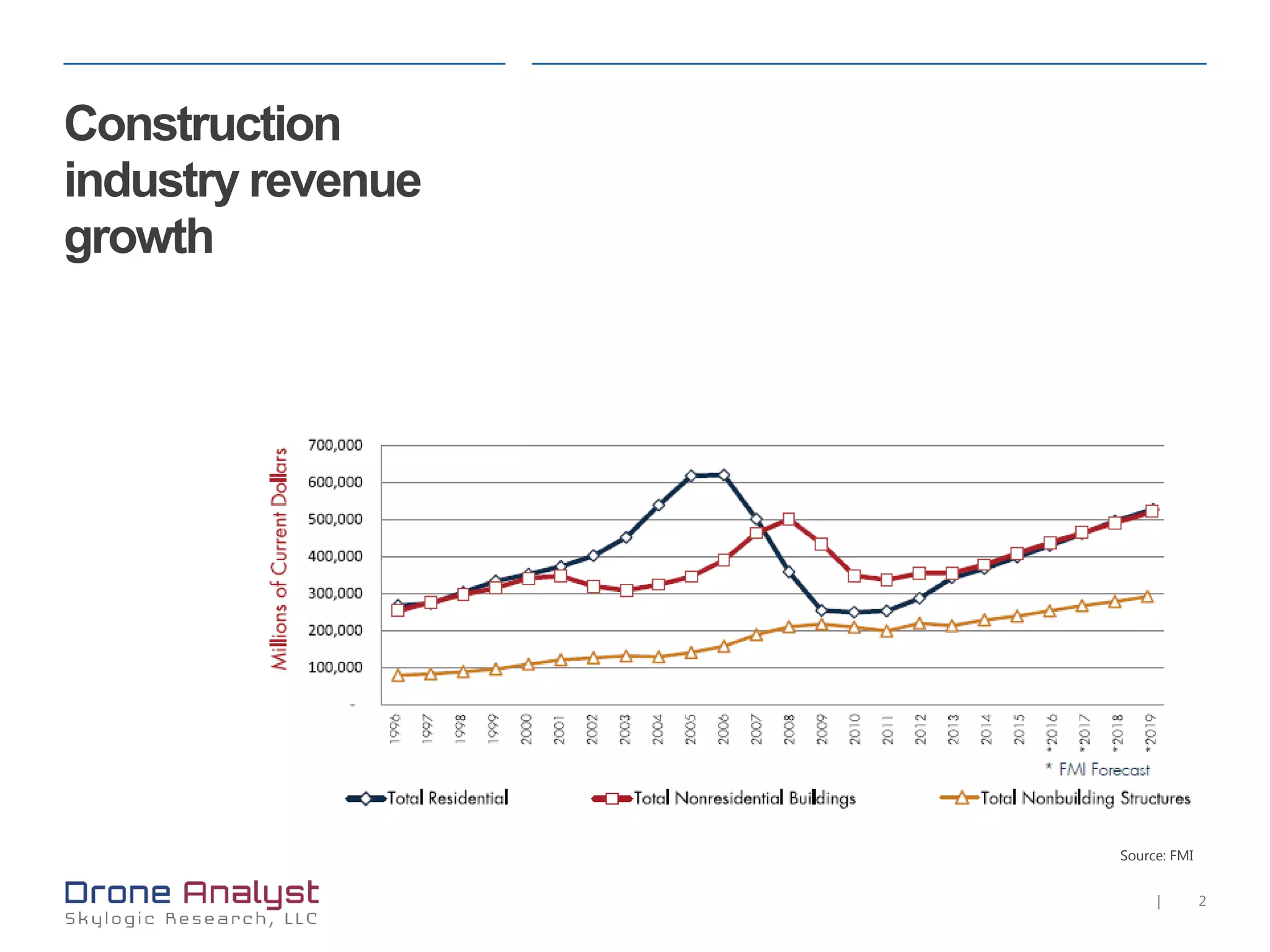 The document discusses the transformative impact of drones on the construction industry, estimating that $11.2 billion of the projected $100 billion in global drone spending over the next five years will come from this sector. It highlights various technologies related to drones, including orthomosaic photogrammetry, digital elevation models, lidar, point clouds, and building information modeling (BIM), all of which enhance efficiency and accuracy in construction processes. The document also emphasizes the role of thermal imaging in identifying insulation issues, demonstrating the broad applications of drone technology in construction.