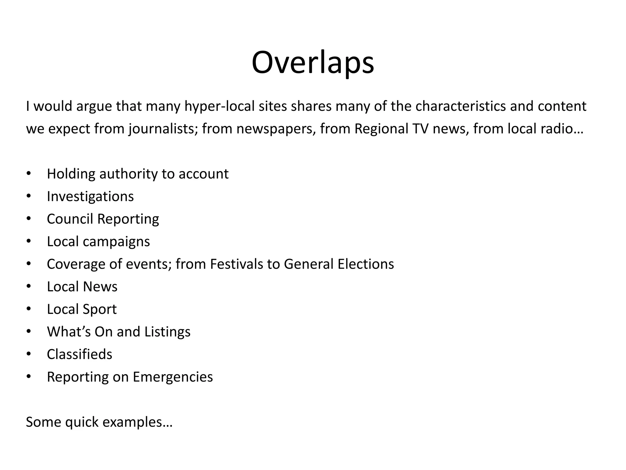 The document outlines ten hyper-local trends, emphasizing community empowerment, transparency, and engagement in local governance. Key points include the 'Big Society' initiative aimed at decentralizing power, the rise of local television and open data, and the impact of social and location-based services on community connection. It also discusses the evolving landscape of journalism and the integration of hyper-local media, emphasizing the role of citizen journalism and the importance of community-driven initiatives.