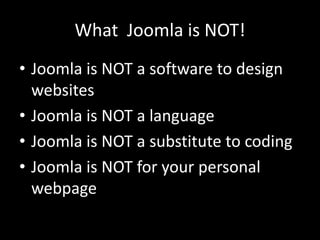 Joomla is a powerful open-source content management system primarily used for publishing large amounts of content online, not a website design software or a substitute for coding. It boasts a robust user community and an extensive array of modules and extensions, making it ideal for dynamic websites. Prominent brands like McDonald's and Sony Pictures utilize Joomla, highlighting its credibility and effectiveness.
