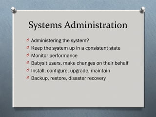 The document provides a comprehensive overview of Linux server administration, detailing tasks such as system monitoring, user and group management, filesystem management, software installation, and networking. Key components discussed include booting processes, runlevels, scheduling with cron, as well as configuring and managing various server services like Samba for file sharing, FTP for file transfer, and Apache for web serving. Additionally, it covers user security, privileges, and the organization of configuration files critical for system administration.