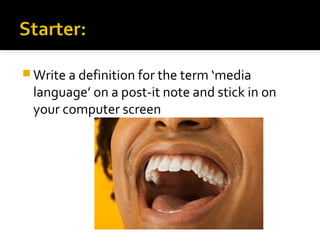 The document discusses media language and its role in creating meaning. It asks students to define key terms related to four technical areas of media - camera angles/shots/composition, sound, editing, and mise-en-scene. Students are tasked with creating an animated storyboard demonstrating a short sequence between two characters with a secret, using correct terminology and showing how they would film, edit, and set up shots and sounds. They are then asked to analyze their work and identify examples of how they used the four technical areas to create meaning.