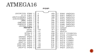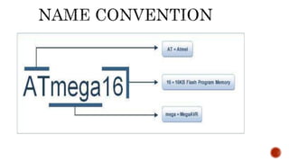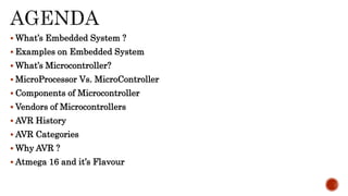 This document provides an overview of embedded systems and microcontrollers. It defines embedded systems as dedicated systems that are hidden parts of larger systems. Microcontrollers are described as single-chip computers containing a CPU, memory, and I/O ports. The key differences between microprocessors and microcontrollers are explained. The document also discusses common microcontroller vendors including Atmel, various AVR microcontroller categories and features, and the Atmega16 microcontroller in detail.