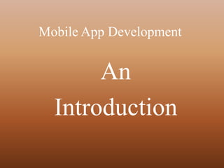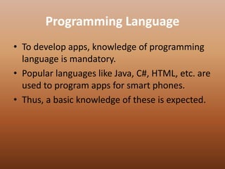 This document provides an introduction to mobile app development, emphasizing the need for programming languages like Java, C#, and HTML. It outlines minimum requirements for PCs and the software environment necessary for building applications, including specific Integrated Development Environments (IDEs) for Android, iOS, and Windows Phone. Additionally, it discusses cross-platform development options using tools like Xamarin and Visual Studio.