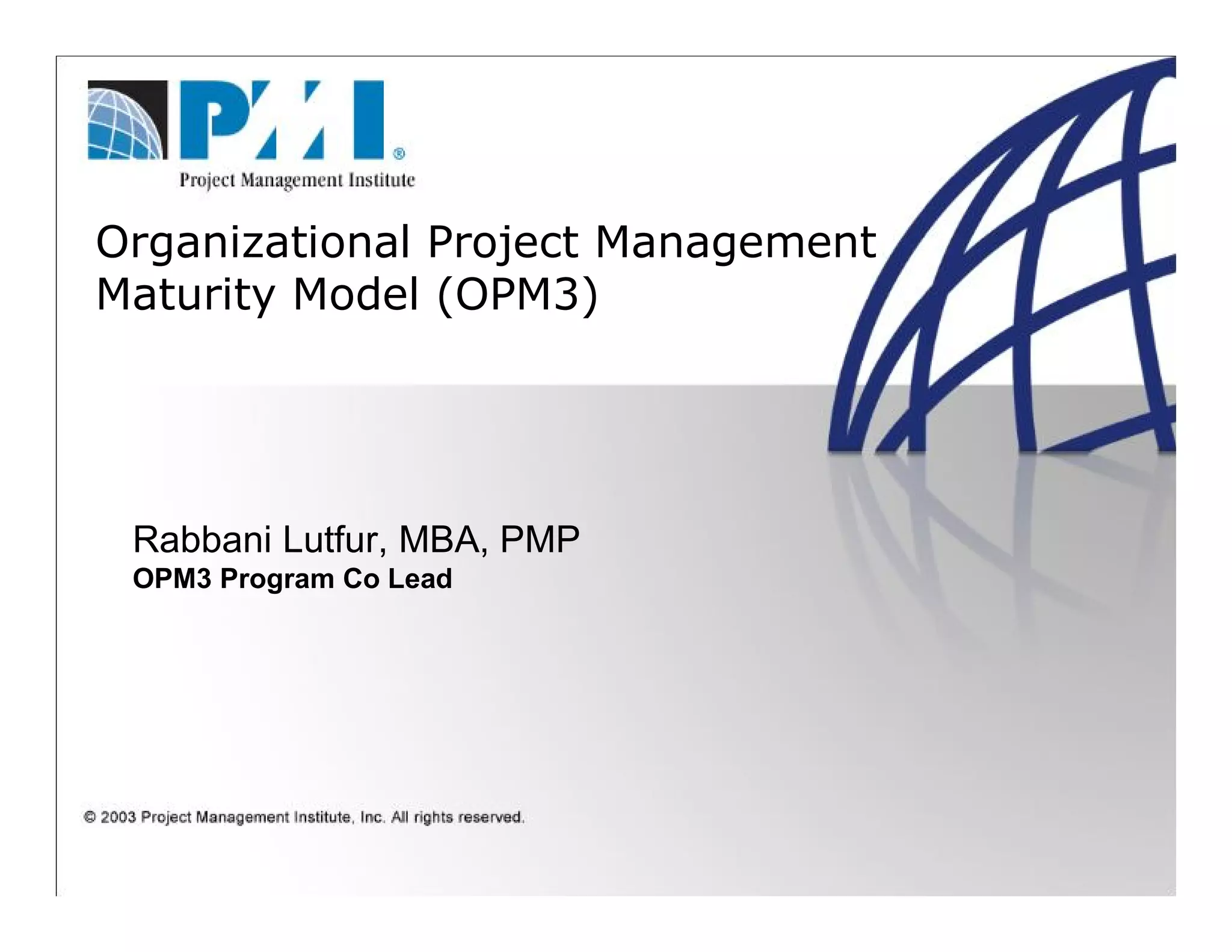 The document discusses the Organizational Project Management Maturity Model (OPM3). It describes OPM3 as a framework that organizations can use to assess and improve their organizational project management capabilities. OPM3 categorizes best practices and capabilities according to project management process groups and organizational project domains. Once implemented, OPM3 will help organizations understand their project management maturity, align projects with strategy, and improve outcomes. The OPM3 standard will be released in December 2003 to help organizations strengthen their project management practices.