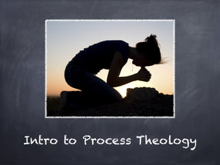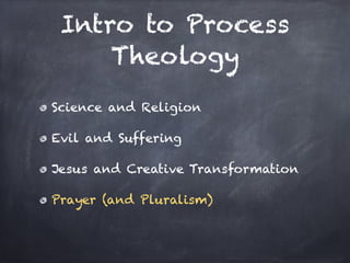 This document provides an introduction to process theology. It discusses key concepts like God's power being persuasive love-power rather than omnipotent power, and the world and God having a shared and interdependent power. It also covers topics like the nature of prayer as changing both the individual and God, and opening ourselves to God's creative energy. Prayer is a partnership between the individual and God rather than a way to manipulate God. Process theology sees the universe as creative, interconnected, and open to future change with God as a relational presence in all of existence.
