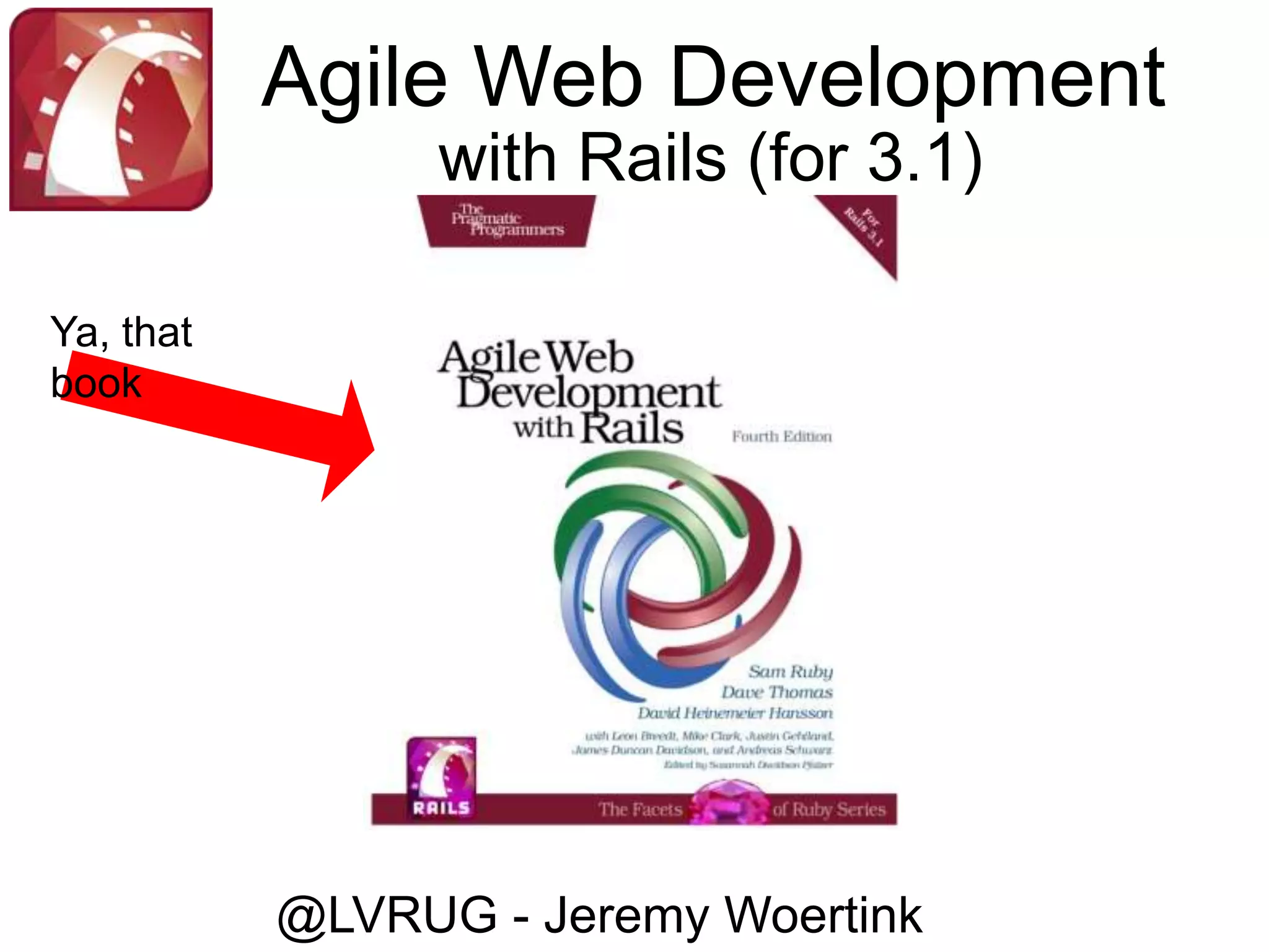 The document provides an overview and introduction to Ruby on Rails (Rails), an open-source web application development framework written in Ruby. It discusses that Rails makes web development easier through its model-view-controller architecture and conventions. Examples are given of major websites built with Rails like GitHub and Groupon. The document then walks through installing Rails and generating a basic Rails application with a controller and linked views to get started building a dynamic web application.