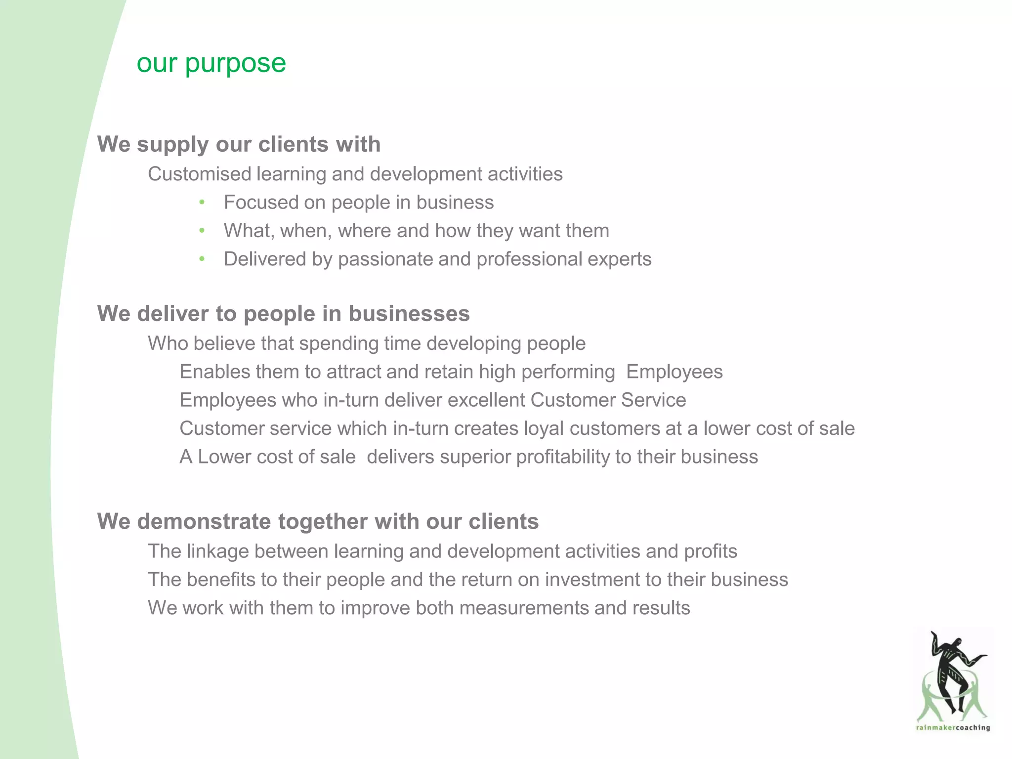 The document outlines a consulting firm's focus on customized learning and development activities aimed at improving employee performance and organizational profitability. It highlights the various consultancy services offered, including business planning, coaching, and training programs, specifically designed to enhance skills in business development and project management. Client testimonials emphasize the positive impact of these services on business strategy and individual professional growth.