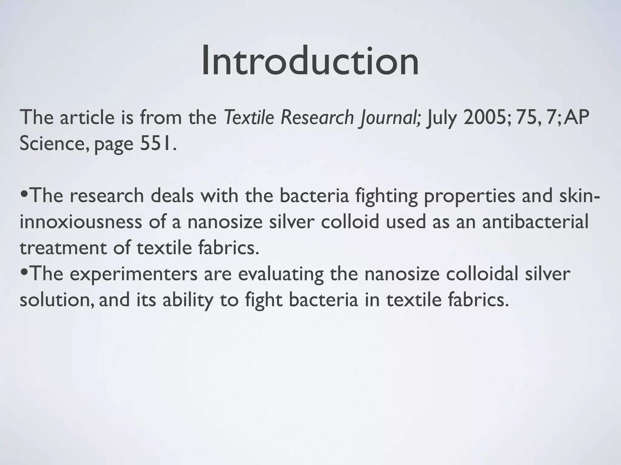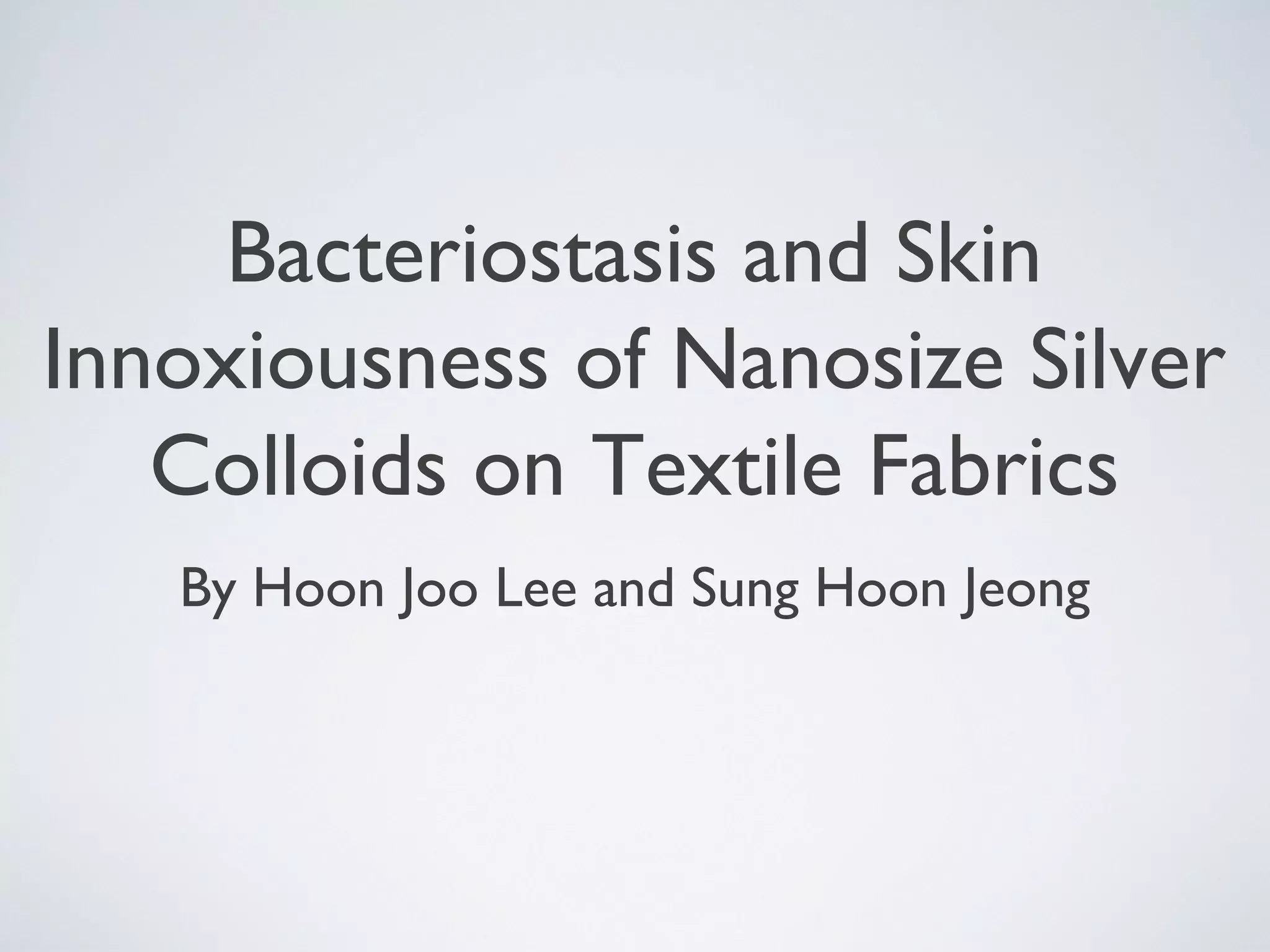 The document summarizes a study that tested the antibacterial properties and skin safety of nanosize silver colloid solutions applied to textile fabrics. The researchers found that the silver colloid killed over 99.99% of bacteria on the fabrics and maintained its antibacterial efficacy even after 10 washes. Skin tests on rabbits showed the silver colloid caused little to no irritation. The study demonstrated that nanosize silver colloids can be safely used as an effective antibacterial treatment for textiles.